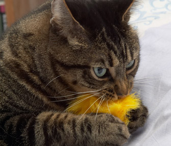 Be careful when using any toy with string, ribbon, yarn, or rubber bands, as they are potentially deadly if swallowed. Even a senior cat can swallow these accidentally because cats have tongues covered with rearward-facing barbs that make it hard for them to spit out string, yarn and similar things. Such long objects, if ingested, tend to travel lengthwise along the intestines. They can cause the intestine to scrunch up accordion-style, even turning in on itself just like a sock. This is a life-threatening medical condition that usually requires surgery to correct. You can play with such toys with your cat, but always put them away in a safe place once your playtime is over.